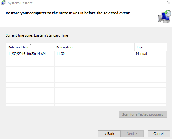 Under the System Restore section, find a restore point that works for you. Restore points are listed by date, and created automatically when major registry changes occur (such as when you install new programs). Choose a restore point from before the time your computer started developing noticeable issues.