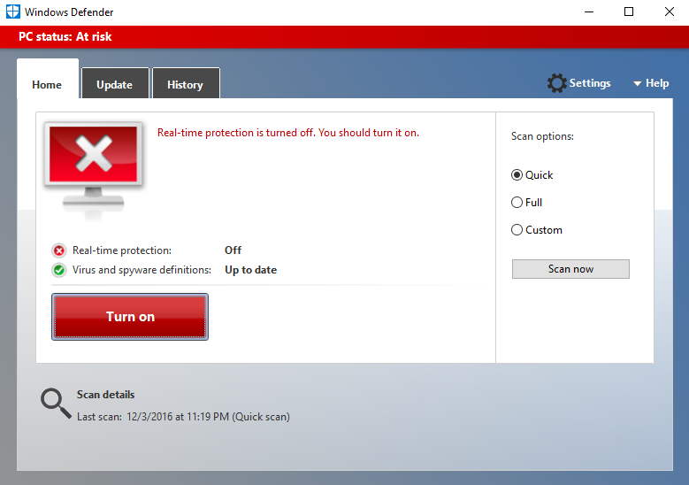 Windows 8 and beyond come bundled with what’s known as Windows Defender. This is Microsoft’s home grown anti-malware program. During our testing, we found that Windows Defender actually did a fairly good job of preventing us from downloading malware. In fact, in order to download any real or even test malware, we had to turn Windows Defender off, as the program would block all of our attempts with the various malware we tried to download.